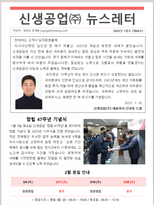 신생공업(주) 뉴스레터 1월호(제66호)