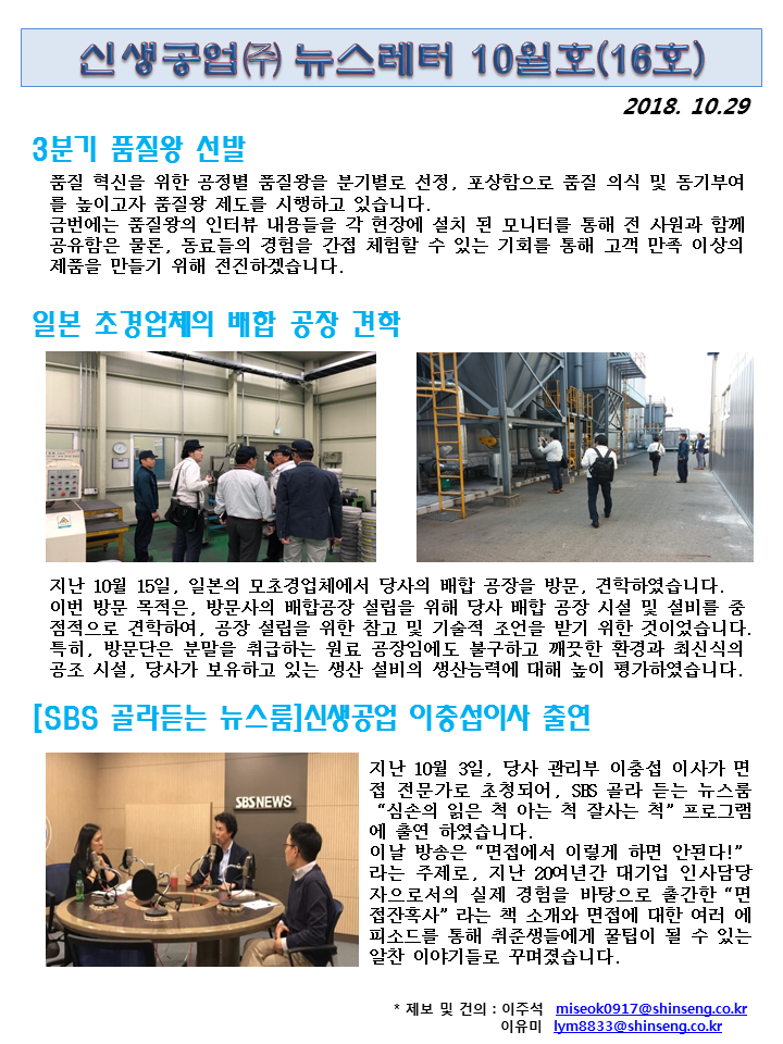신생공업(주) 뉴스레터 10월호(제16호)