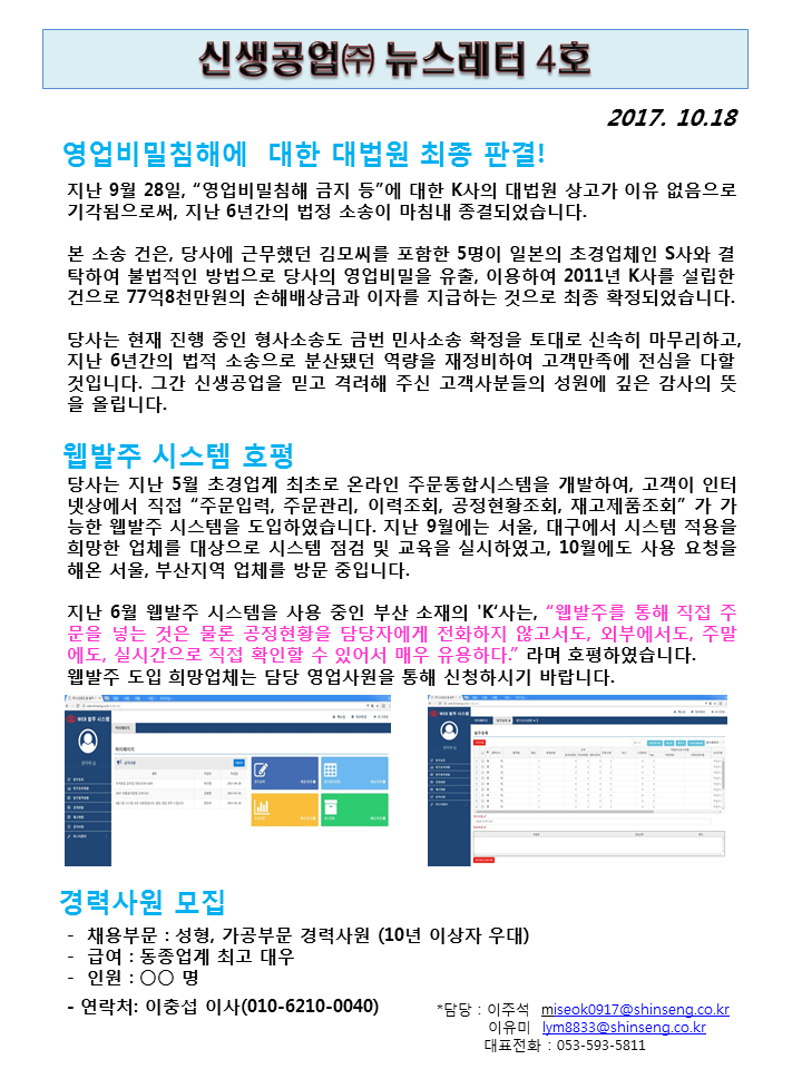 신생공업(주) 뉴스레터 4호(2017.10.17)