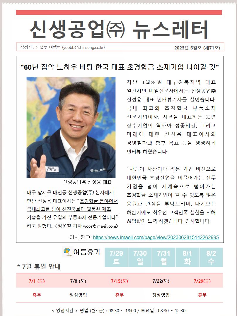 신생공업(주) 뉴스레터 6월호(제71호)