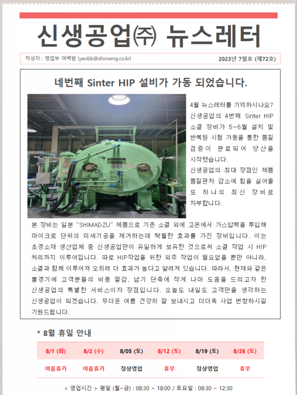 신생공업(주) 뉴스레터 7월호(제72호)